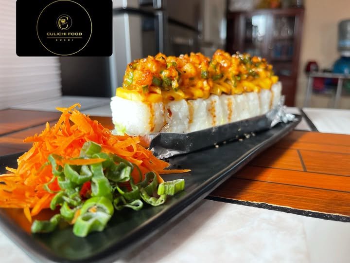 Forrado de plátano macho, horneado con topping de camarón spacy